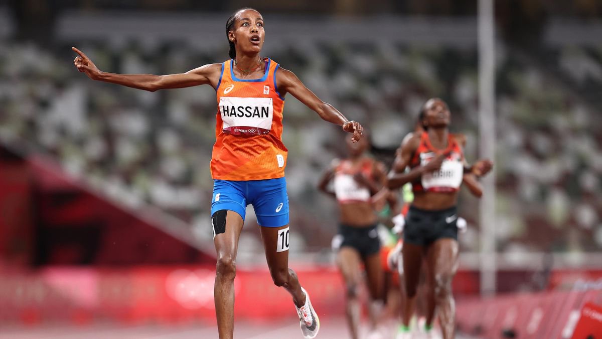 Netherlands' hassan dominates 5000m, wins gold by huge gap.